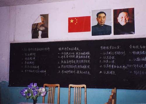 会議室にはマルクス、周恩来、ケ小平の肖像画が貼ってある。授業中の挙手は肘を机についたまま、